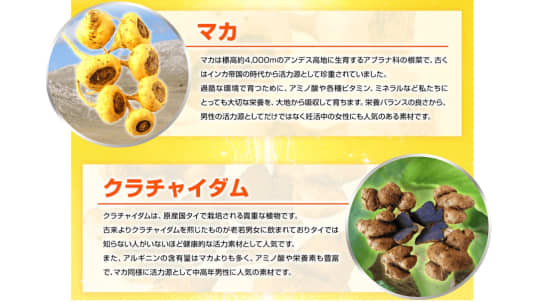 マカとクラチャイダムは、ともにホルモンや体組織の材料となり、筋肉の運動能力や疲労回復力をサポートする必須アミノ酸が非常に多い植物。