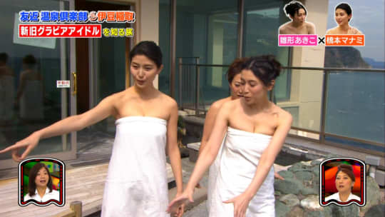 おっぱいが今にもポロリしそうな格好で温泉に入っています。